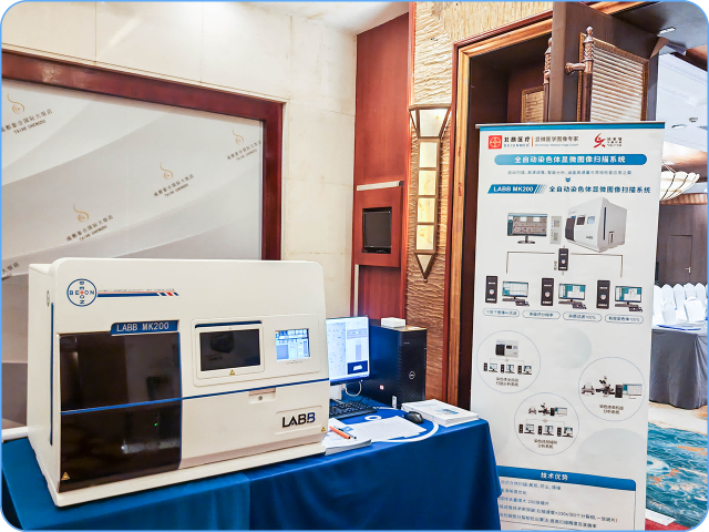 会议期间,北昂医疗展出的全自动染色体显微图像扫描系统LABB MK200同样备受关注。该设备以其精巧的工业设计、高度自动化的操作流程,生动展示了“细胞遗传学染色体自动化智慧实验室”关键环节的技术实现。通过现场实时演示,观众直观了解到系统如何实现玻片自动装载、智能寻焦、高速扫描及AI图像预分析,将传统镜下人工搜寻转变为高效、标准的自动化作业,有力回应了应急场景对高通量、快速响应的迫切需求。