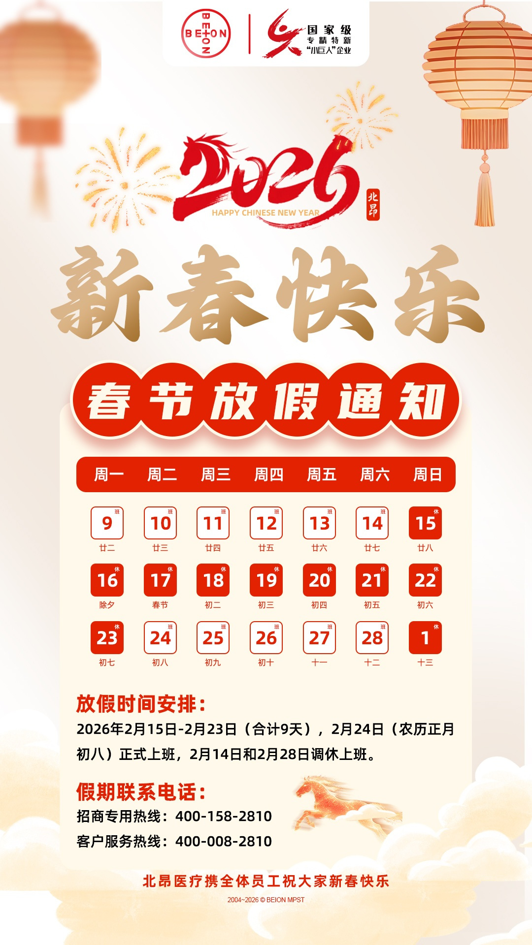 为方便您提前规划,北昂医疗的春节假期安排如下: