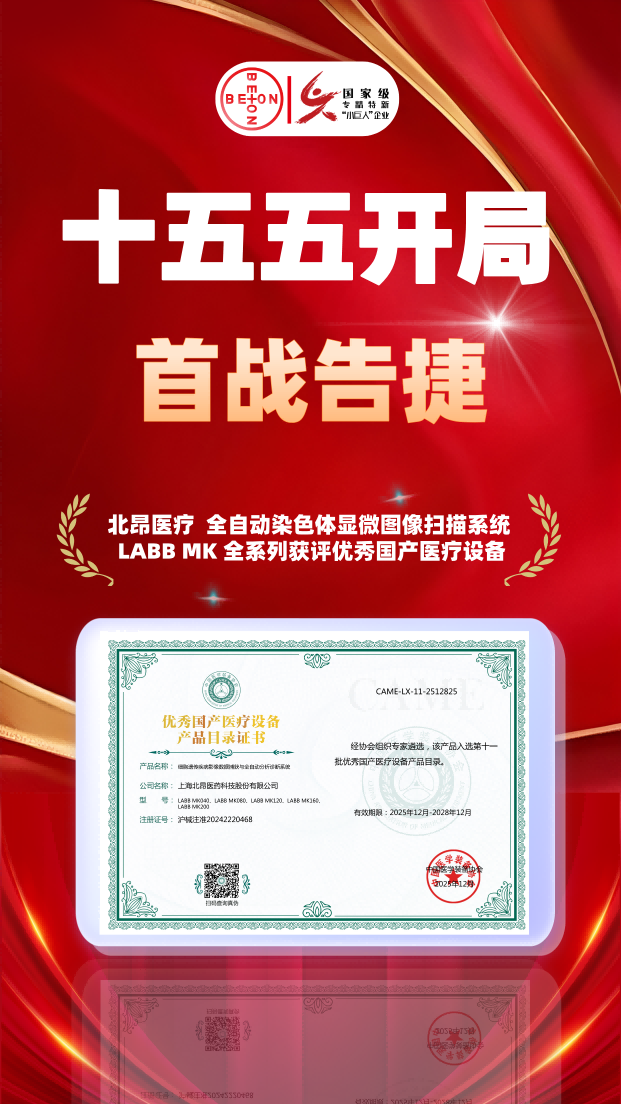 近日,备受瞩目的第十一批《优秀国产医疗设备产品目录》遴选结果正式发布。北昂医疗自主研发的全自动染色体显微图像扫描系统 LABB MK系列,凭借卓越的技术实力与临床价值,成功入选“细胞遗传疾病影像数据捕获与全自动分析诊断系统”品类,在“十五五”开局之年斩获国家权威认证,成为该领域的标杆产品。